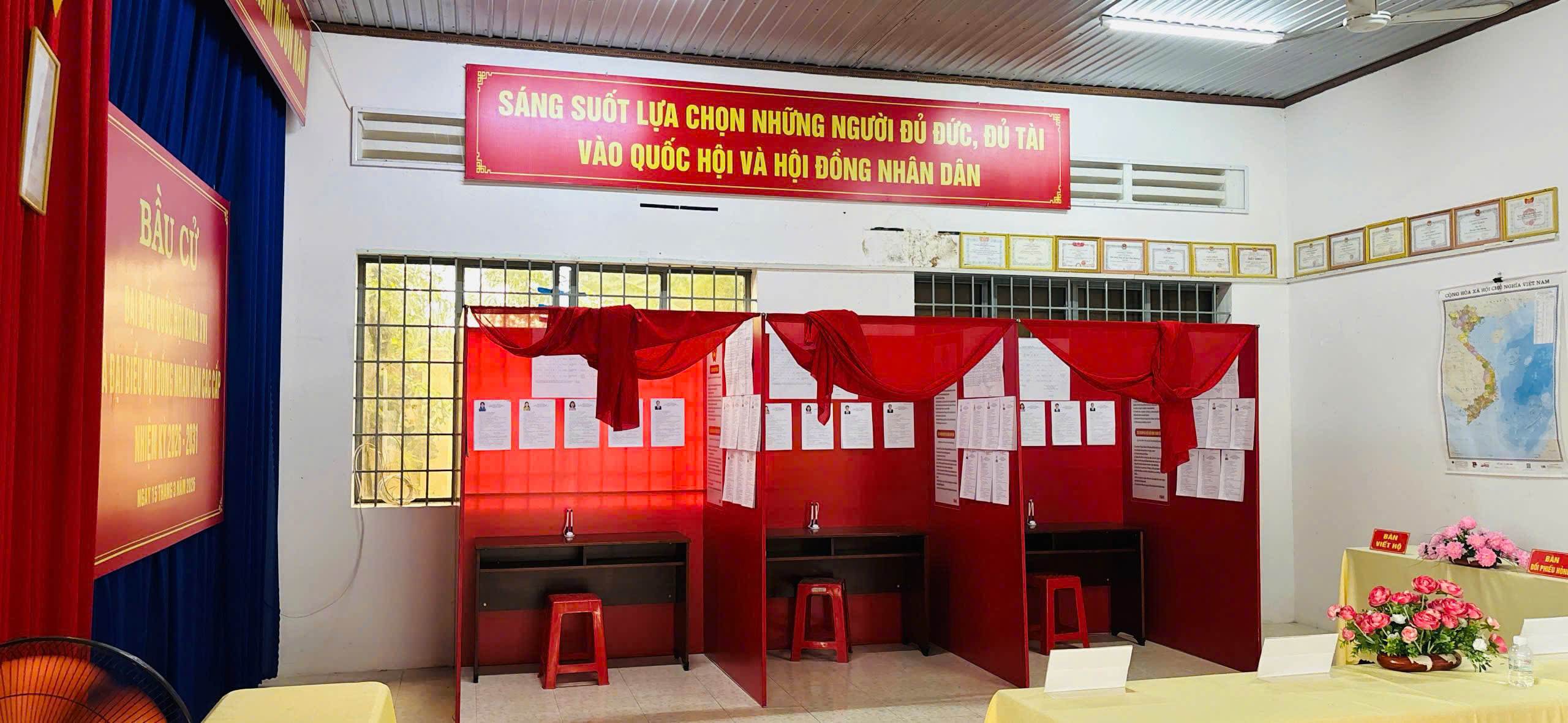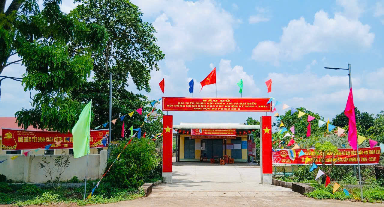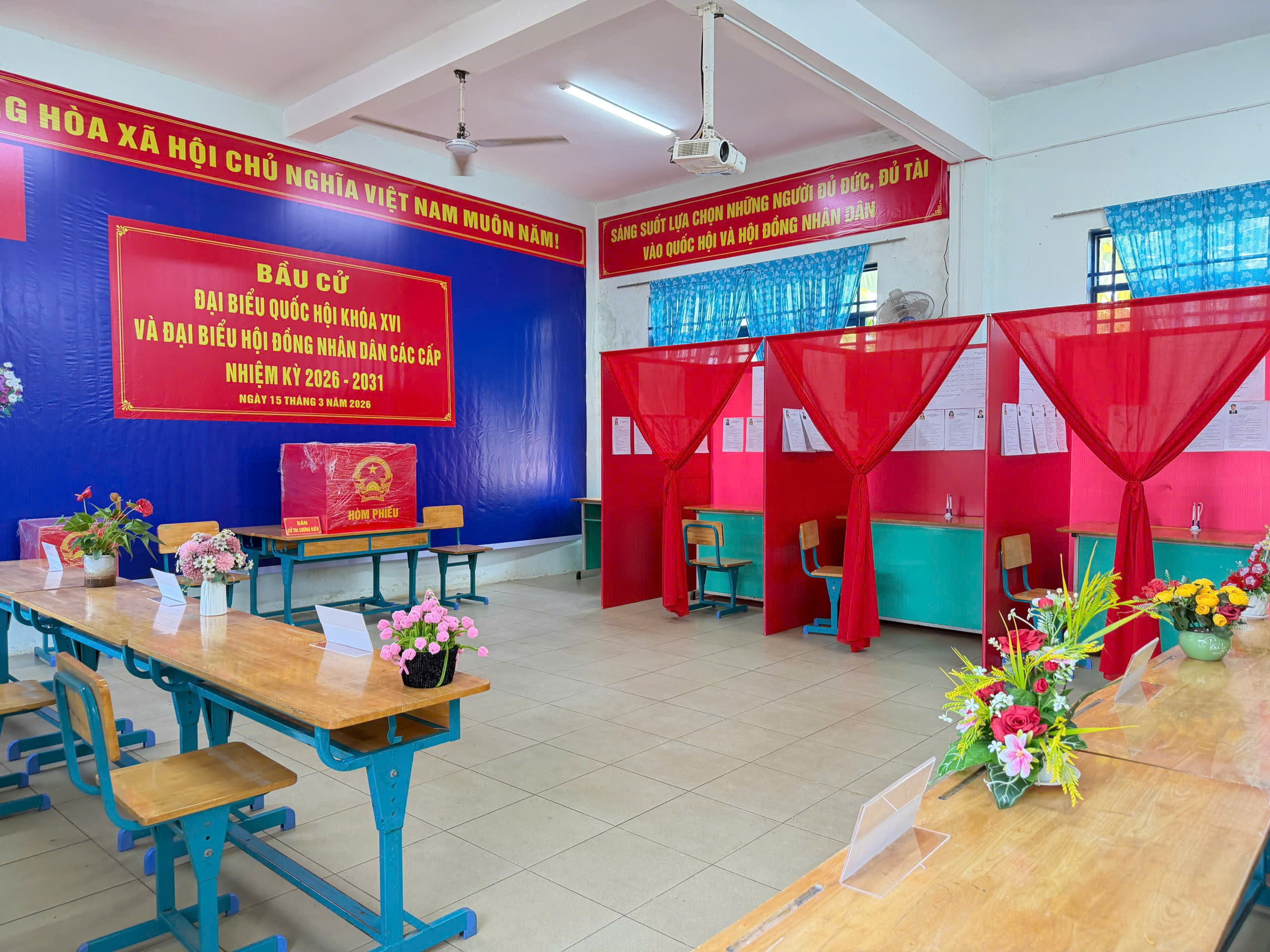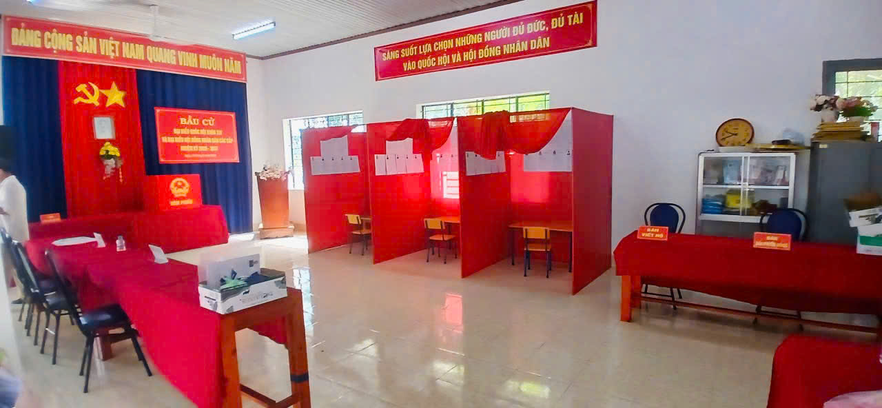 Cờ Tổ quốc, băng rôn, khẩu hiệu được treo trang trọng; danh sách cử tri, danh sách và tiểu sử người ứng cử được niêm yết đầy đủ, đúng quy định. Việc sắp xếp khu vực bỏ phiếu được bố trí hợp lý, đảm bảo thuận tiện cho cử tri tham gia bỏ phiếu trong ngày bầu cử.