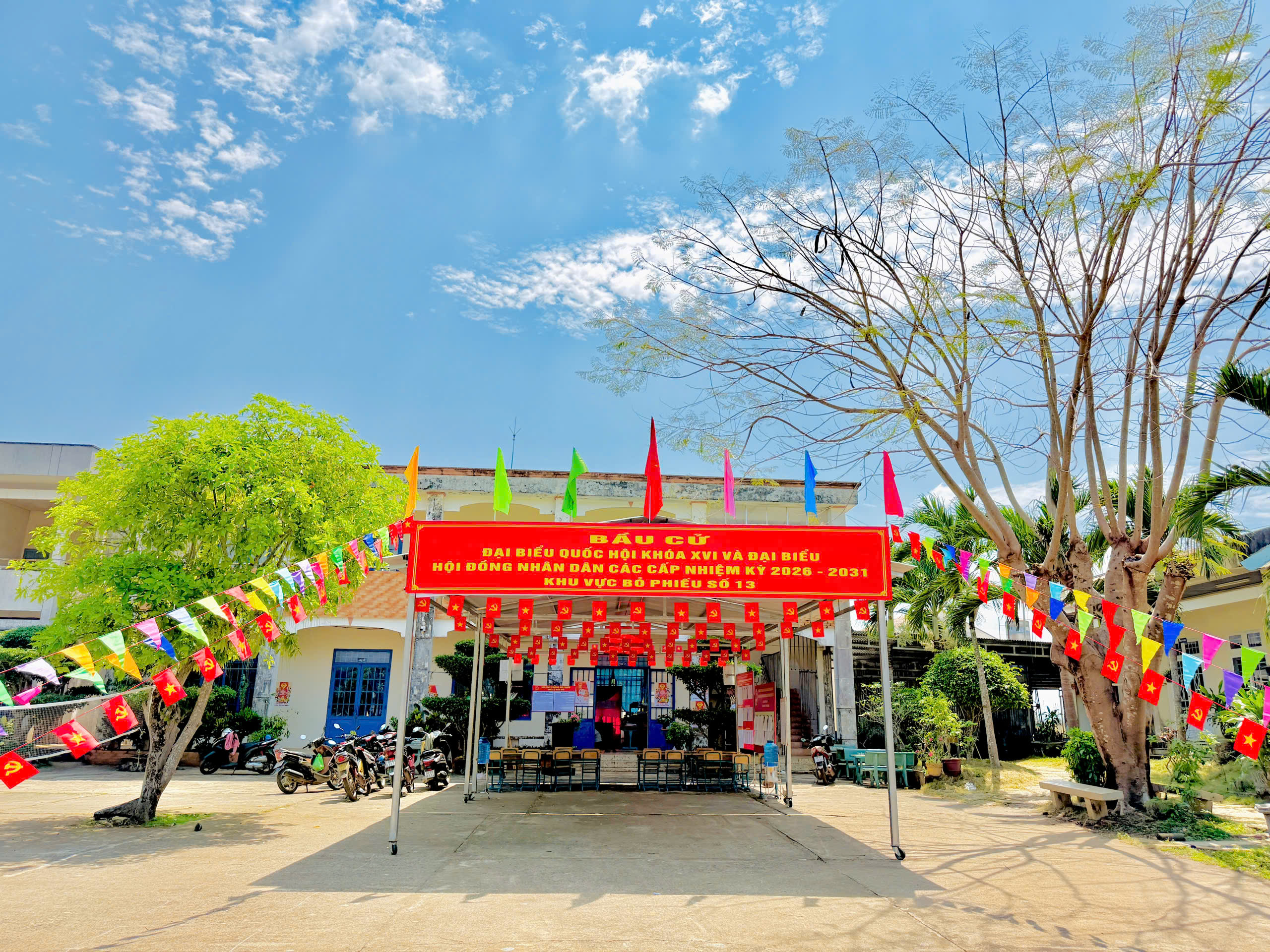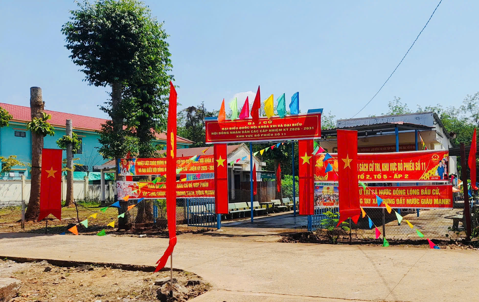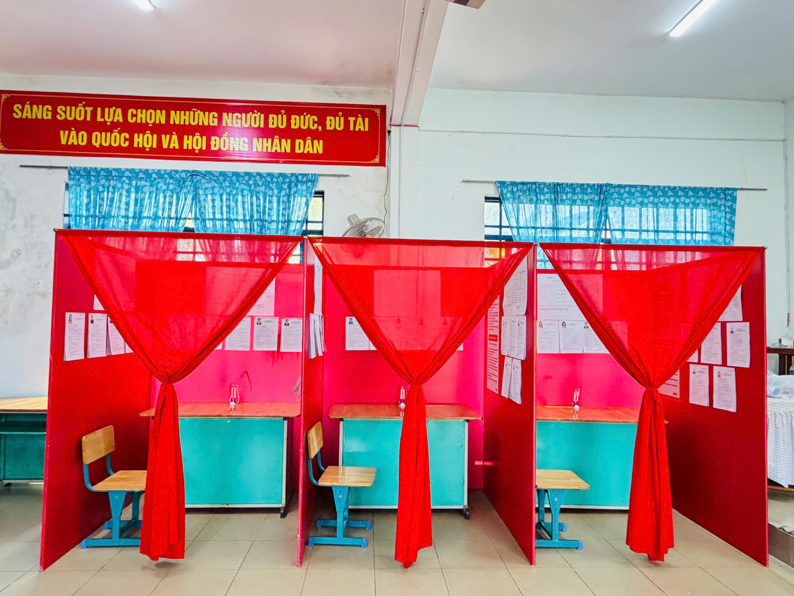 Cờ Tổ quốc, băng rôn, khẩu hiệu được treo trang trọng; danh sách cử tri, danh sách và tiểu sử người ứng cử được niêm yết đầy đủ, đúng quy định. Việc sắp xếp khu vực bỏ phiếu được bố trí hợp lý, đảm bảo thuận tiện cho cử tri tham gia bỏ phiếu trong ngày bầu cử.