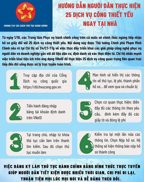 Từ ngày 1/10/2025, tại Trung tâm Phục vụ hành chính công xã Xuân Đường sẽ ngừng tiếp nhận hồ sơ giấy đối với 25 dịch vụ công thiết yếu. Người dân sẽ thực hiện thủ tục hoàn toàn bằng hình thức trực tuyến, giúp tiết kiệm thời gian, chi phí và nâng cao tính minh bạch trong giải quyết hành chính.